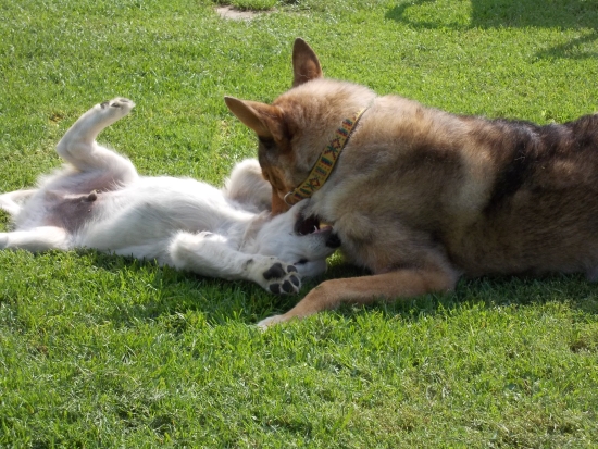 Einen Nachmittag lang kam Bettina, die Kollegin von der Chefin und ihre Kinder und Sam und Kira, ihre Hunde.