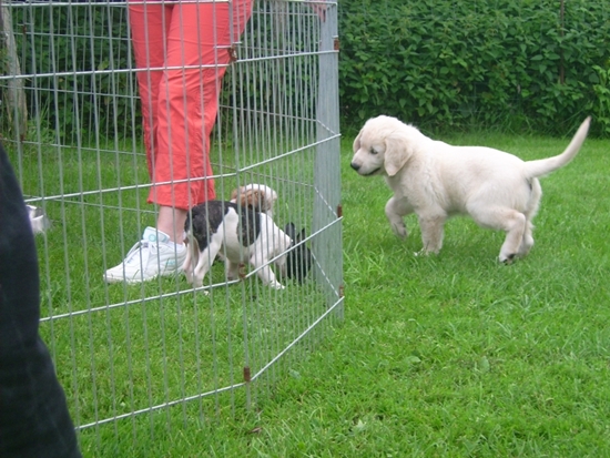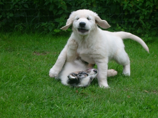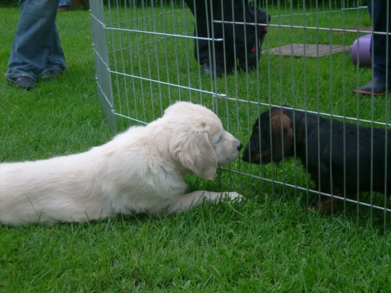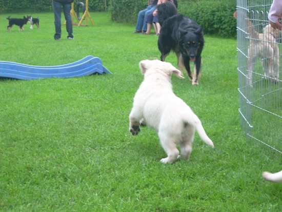 Schwupps, wurde ich von festen Händen hoch gehoben und auf den Arm genommen (Die Chefin hat später gesagt, dass ich in ihrer ganzen Karriere als Hundetrainer der erste Golden Retriever bin, der schon in den ersten fünf Minuten wegen Rüpelns auf den Arm genommen werden musste): Ich war so was von sauer, mein Wutgeschrei hat man bestimmt noch 10 Hundeplätze weiter gehört. Dann stellte ich fest, dass es nur Iris war, die mich retten wollte, so ein nettes Zusammentreffen!