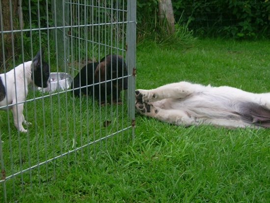 Nach einer Pause, wo die Menschen allerlei geredet haben, habe ich dann erste Spielkontakte gewagt. Erst war es ein bisschen schwierig, alle meine neuen Freunde waren hinter einem Gitter, aber dann habe ich doch ein nettes Mädel gefunden. Hab mich erstmal draufgesetzt, aber nachher durfte sie auch auf mir rumkauen.