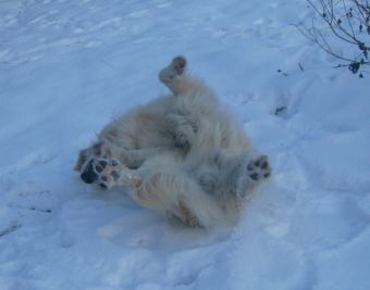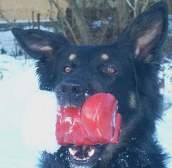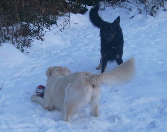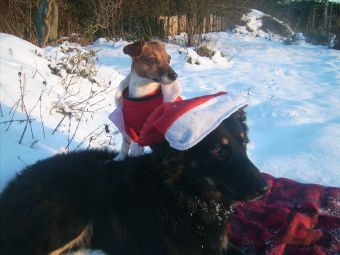 Danach durften wir uns erholen und im Schnee toben. Jack hatte sich aus der Weihnachtstüte einen roten Stiefel geklaut und schüttelte ihn mit viel Erfolg zu Tode.