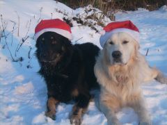 Letztes Jahr war es noch ein rechter Kampf, denn mein Platz-Bleib war als 6-monatiger Jungspund natürlich noch ein bißchen unterentwickelt. Außer dem verlor Ginny ständig ihre Mütze und bei unserem guten alten Bossi-Hasenohr wollte auf den spitzen Ohren sowieso keine Mütze halten.