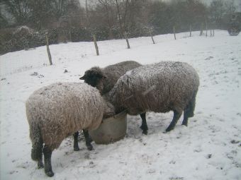 Die Schafe gehören eher zur stoischen Fraktion, sie lassen sich einfach einschneien, Hauptsache es ist genug Futter da.