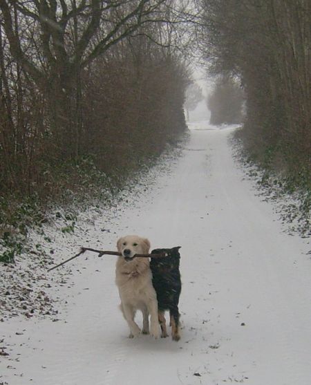 Wieder auf offenem Feld wollte die Chefin noch ein Porträt von uns im Schnee komponieren, was aber völlig in die Hose ging: Ginny wurde zitternderweise aus dem Bild geweht und Jack fand es auch nicht wirklich witzig im Eiswind heroisch in die Kamera zu blicken. Ich hingegen war so albern, dass ich erst mal einen Schneeengel produzierte und ich mich anschließend in die nächste Schneewehe stürzte.