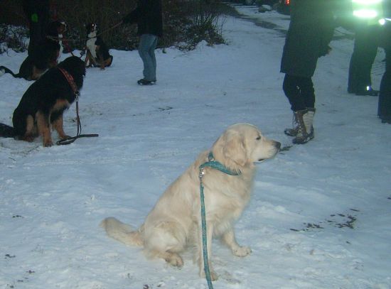 Wir trafen uns auf einem Parkplatz, und obwohl Schnee lag und es schon langsam dämmerte, waren alle Hunde gekommen, die sich angemeldet hatten. Statt Freilauf (den hätten Jack und ich uns auf dem Parkplatz natürlich sehr gut vorstellen können), gab es markante Anweisungen, wie die Hunde an der Straße an der Leine zu führen sind und los ging es.
