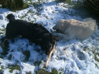 Die Chefin nimmt uns immer mit, wenn die Schafe gefüttert und gezählt werden, denn es ist Lammzeit und man weiß nie, wie viele Schafe man morgens antrifft. Jack ist natürlich ganz brav und macht einen auf Hütehund, während ich versuche, mich unerkannt unter die Schafe zu schummeln und mit zu schnabulieren. Manchmal klappt das auch, aber meistens schimpft die Chefin sofort: „Hau ab da, Carlos, lass die Schafe in Ruhe fressen!“