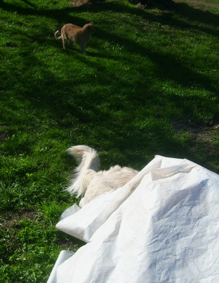 Irgendwann verlagerte sich das Spiel sogar unter die Folie, was selbst den ungläubigen Kater heranlockte. Ach, was hatten wir Spass!