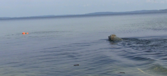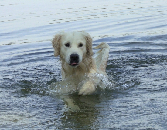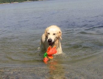 Nachdem wir eine letzte, zu diesem Zeitpunkt etwas lustlose Mini-Vorstellung in Halle 4 absolviert hatten, ging es schnell nach Hause. Die Chefin hatte sich ein tolles Belohnungsbonbon für ihren Lieblingsretriever ausgedacht – Baden im See und zum Apportieren eine orange-Dummy-Ente: ich war völlig aus dem Häuschen: