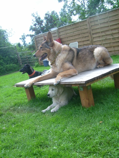 Papa Bosse ist immer lieb und nett. Er will nur nicht zusammen mit mir auf dem Schaffell liegen, da wird er grantig. Aber ich darf neben ihm laufen, er schnuppert mich ab und wird auch nicht sauer, wenn ich mal spielerisch an ihn ranhoppse.