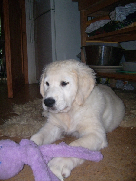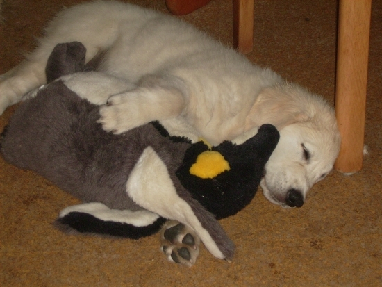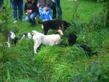 In der Welpenschule habe ich jetzt auch ein paar Freunde. Ich stehe eher auf die kleineren Hunde, die können mich wenigstens nicht umrennen. Ich muss mich nur konzentrieren, dass ich nicht mit meinen Pfoten auf ihren Rücken treten – dass mögen die irgendwie nicht.
