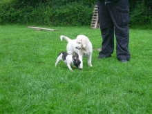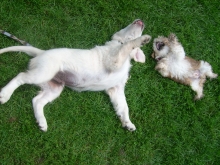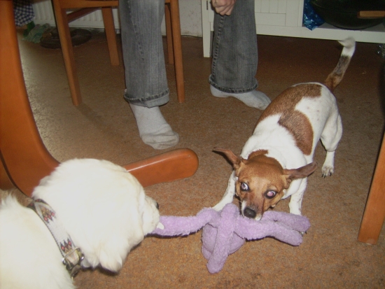 Erst durfte ich beim Ballspielen mitmachen und jetzt spielen wir schon ein bißchen zusammen. Naja, Spielen – also Jack fällt um, möglichst auf mich drauf und wälzt sich und bellt und ich kann ganz flach am Boden hin und herrobben – und immer wenn ich gerade so ein bißchen aufdrehen will, springt er wütend auf, und motzt mich an, dass ich mich unterordnen soll- Spassbremse!