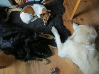 Jack war voll auf Valium als er zu uns zurückkam und konnte kaum geradeaus laufen. Ginger und ich hätten ihn in unserer Wiedersehensfreude wohl umgepanzert, aber da wurde die Chefin kurz zur schützenden Übermutter und verscheuchte uns von ihrem geliebten kleinen Jacky. Liebevoll legte sie ihm sein Schaffell ins Büro und hütete seinen Genesungsschlaf.
