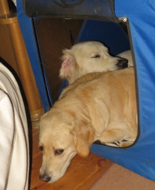 Gestern Abend, als ich noch unschuldig und naiv nach getanem Tagwerk in die Box gewankt war, um gemütlich auf dem Schaffell zu chillen, kam Ginger einfach mit hineingeschlüpft und legte sich quasi auf mich drauf. Und weil das noch nicht spaßig genug war, hat sie auch noch Jack mit hinein gelockt. Für ein paar Minuten herrschte großes Kuddelmuddel, aber dem Schwarzen wurde es schnell zu warm und er hat sich in seinen Korb zurückgezogen. Nachdem Madame ihn dort noch ein Weilchen genervt hat – sie hat sich de facto auf seinen Kopf gesetzt und trotz fürchterlich gefletschter Zähne in seine Pfoten gebissen, kam sie zurück zu mir in die Box und wir haben es uns gemütlich gemacht.