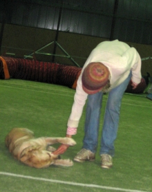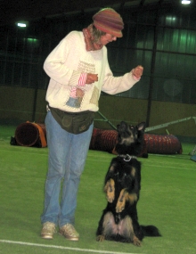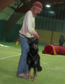 Zunächst waren wir, die Chefin insbesondere, allerdings etwas überfordert. Statt allein mit ein paar guten Freunden zu trainieren, auch Moni war mit Ronja und Annouk gekommen, fand neben uns ein lautstarkes Agility-Training mit hoch erregten Hunden statt. „Da können wir ja gleich nach Hause fahren, hier kann ich mit Jack überhaupt nicht arbeiten,“ jammerte sie und tatsächlich fuhr sich Jack völlig hoch, nachdem direkt beim Aussteigen schon der erste frei laufende Hund auf uns zu geschossen kam.