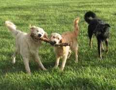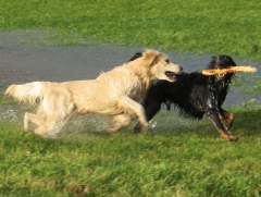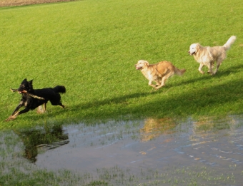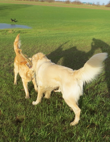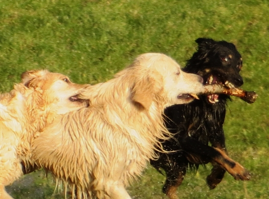 Dann war kein Halten mehr: Durch das Wasser, um das Wasser und im Wasser wurde herzhaft gekämpft und gerangelt und die Chefin musste immer wieder Stock-Nachschub organisieren.