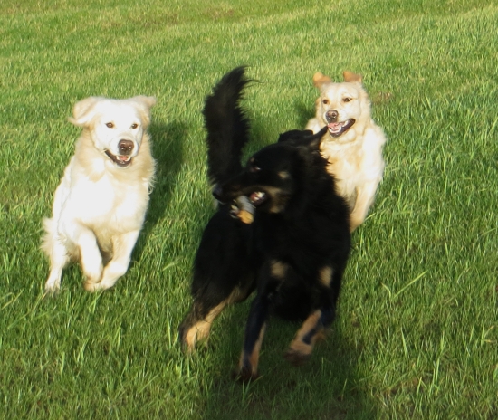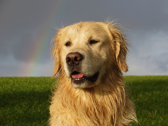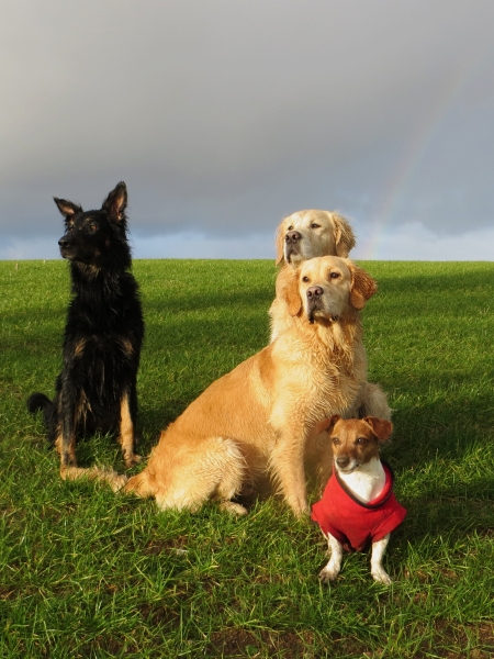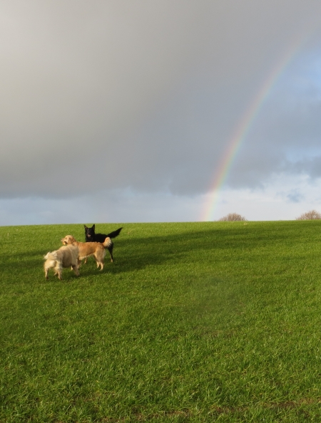 Um das Paradies-Fealing komplett zu machen, spannte sich plötzlich ein wunderschöner Regenbogen über die Wiese (sagte die Chefin, uns Hunde interessierte das eher peripher - wir bekamen Leckerchen für schöne Fotos, mussten allerdings unser wildes Spiel unterbrechen).