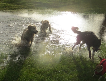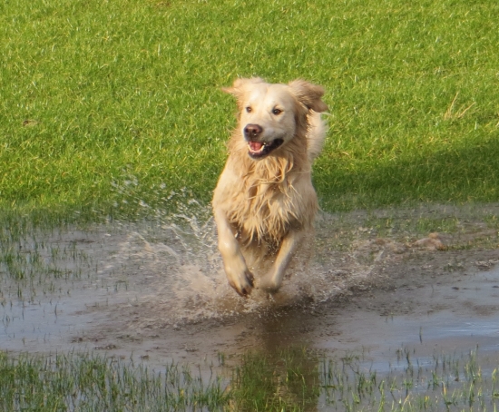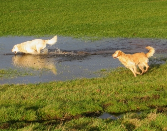 Hinter einem Knick sahen wir es dann auch – der ewige Regen hatte eine Wiesensenke geflutet und mit Sonne sah es aus wie ein Riesen-Luxus-Schwimmbad extra für Retriever – das Paradies.