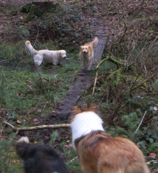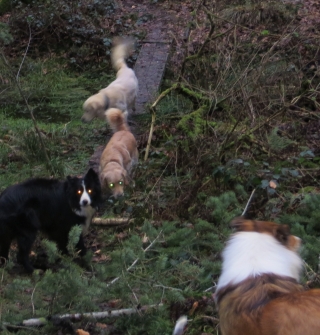 Im Anschluß entdeckten wir einen wunderbar verwunschenen Weiher, den hund mittels eines schmalen Steges überqueren konnte. Sehr lustig! Ginger und ich flitzten hin und her, während Ronja damenhaft überlegte, ob sie sich die Füße nass machen sollte. Annouk nahm ihr die Entscheidung ab und startete einen Border Collie Sprint über den Steg – ich bin dann lieber freiwillig in den Weiher gesprungen, bevor ich durch ein weißzahniges Border-Lächeln dazu gezwungen werde.