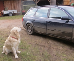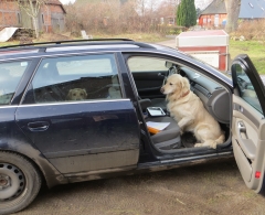Pustekuchen, ich wurde des Kofferraumes verwiesen und so schlüpfte ich schnell vorne rein. Aber auch das war falsch und geknickt schlurfte ich ins Haus zurück. Naja, nicht lange und ich war wieder oben auf – Jack und ich bekamen einen soooooo großen Kauknochen!