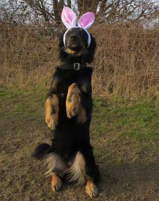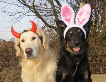 Für Jack waren natürlich die Teufelshörnchen geplant, aber eigentlich steht ihm die Häschenrolle viel besser, finden wir alle. Unser Jacky-Häschen, nach außen hart wie Stahl, aber in unserem Familienrudel das zarte, umsorgende Wesen.