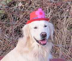 Ginny bekam dann noch eine Extra-Einlage mit Feder-Hütchen. Da muss die Chefin immer alles geben, denn entweder fallen Madame die Teile runter, weil sie ihr zu groß sind, oder das Gummiband spannt oder die Augen sind nicht zu sehen, oder …. - ich glaube ja, Ginny macht das absichtlich, damit sie mehr Leckerchen kassiert. Wenn sie nicht beobachtet wird, hält sie den Kopf samt Hut nämlich ganz still.