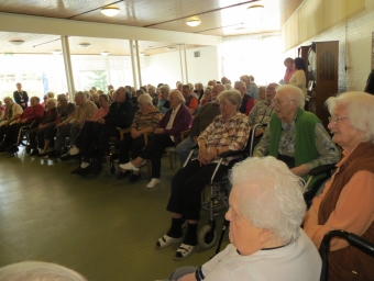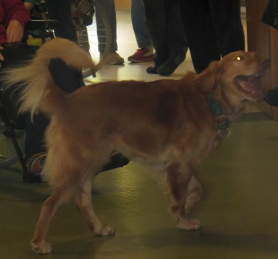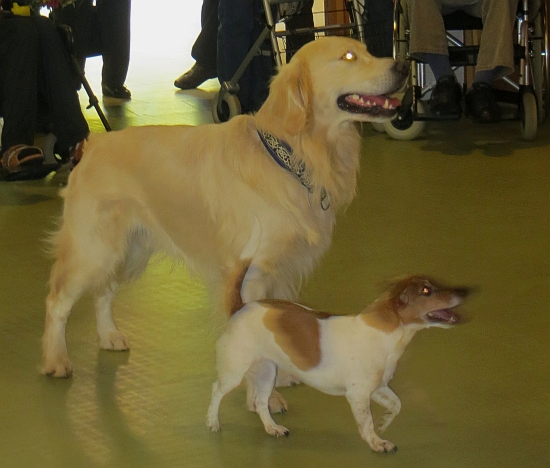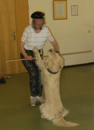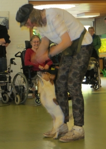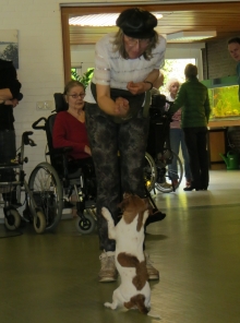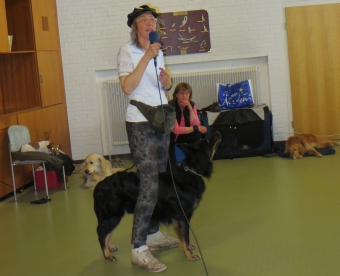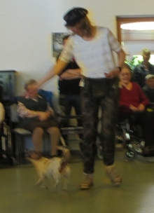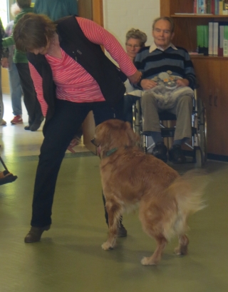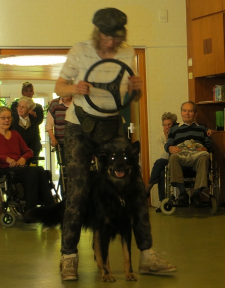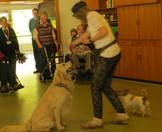 Unterstützt wurden wir von Iris mit Hajo und Lea, die genauso gerne Dogdancen wie wir. Die Chefin war sehr erfreut, dass uns die ganzen Geräusche und die Vielzahl der Rollstühle, Rollatoren und Stöcke nicht interessierte. Sogar unser Püppie Ginger lief durch den ganzen Trubel, als hätte sie noch nie etwas anders getan.