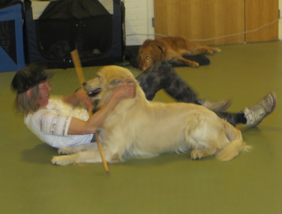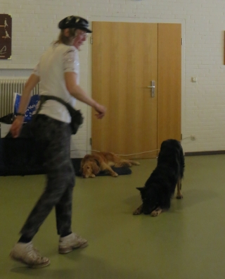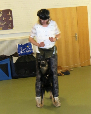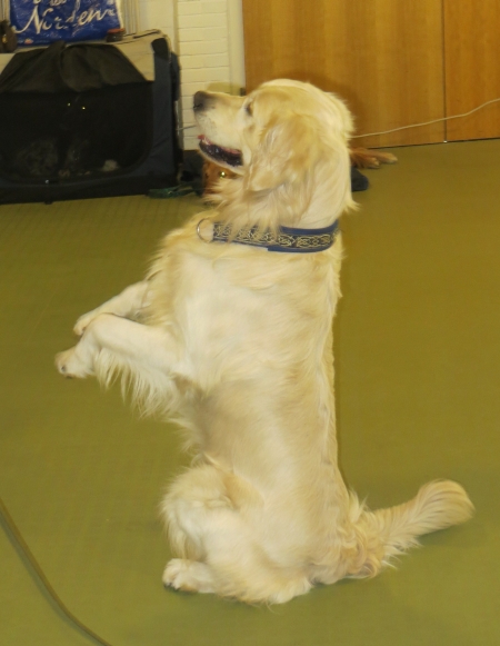Nachdem Ginny erfolgreich ihren Elvis Presley-Song performed hatte - „The Devil in Disguise“ - ungemein passend wie ich finde, war Jack noch einmal zu seiner neuen Kür „Taxi in Paris“ dran. Jetzt zeigte sich seine Reifung richtig: Das merkwürdige Rauschen des Mikrofons hatte ihn im Laufe der Vorführung doch zunehmend irritiert, außerdem war es im Raum echt warm. Früher hätte die Chefin dann aufhören müssen, aber jetzt zeigte sich, dass Jack sich im Arbeiten an ihr festhalten kann und er zeigte alle Tricks. Hinterh durfte er sich dann mit einem Futter-Kong in der Box entspannen, der hatte es gut!