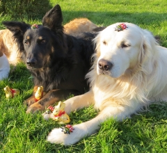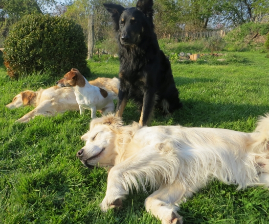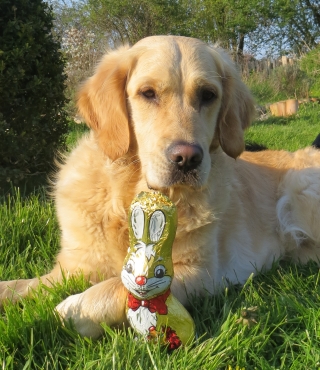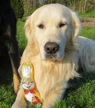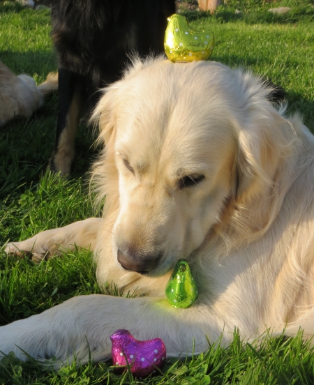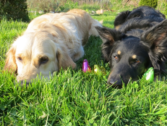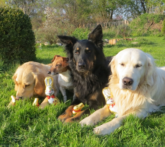 Ihr ahnt es schon, es wurden selbstverständlich wieder passend zum Anlass Osterfotos geschossen. Dabei hätte alles so gemütlich sein können. Wir Hunde aalten uns in der Sonne, chillten nach Herzenslust, da kam die Chefin mit einem Korb bunter aluverpackter Teile.
