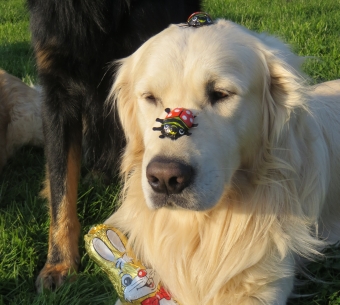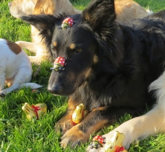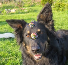 Von diesem ersten Erfolg angespornt, versuchte die Chefin gleich uns andere auch mit den Teilen zu dekorieren. Die Versuche mit Ginger gingen komplett in die Hose – sie war eindeutig der Meinung, dass man Käfer essen und nicht balancieren soll – Kunstbanausin! Ginny war auch sofort aus dem Rennen, die fand schon den Schokohasen zum K....