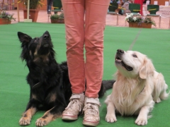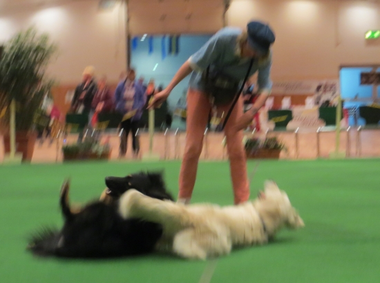 Die Küren liefen prima, ich war ein bißchen hoch gedrallert und hüpfte der Chefin bei den Sprüngen fast ins Gesicht. Dafür hat sie einen Teil der Kür durcheinander gebracht und die Abschlusspose verhunzt – es gleicht sich alles aus. Ginny war großartig – sie ist mittlerweile so routiniert, dass sie ihre Tricks voller Charme zeigt, völlig unbeeindruckt von der äußeren Atmosphäre. Das ist bei Jack völlig anders – er muss sich sehr zusammen reißen, um die Außeneindrücke auszublenden. Dieses Jahr war das besonders schwierig, denn neben dem Ehrenring waren mehrere kleine Rasse- Ausstellungsringe, wo immer wieder laut gebellt wurde.