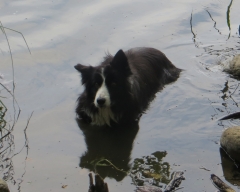 Aber auch die anderen genossen das schöne Wetter, wobei Alter, Rasse und Temperament zu sehr verschiedenen Aktivitäten führten, von albernem Spiel, über Sonnen zu Krokodil-am Ufer-Lauern. Letzteres führte zu einem bedauerlichen Crash, als ich rasant aus dem Wasser rennen wollte und dabei aus Versehen auf das Krokodil Annouk trat. Das gab natürlich eine zickige Abfuhr, aber der Retriever im besten Mannesalter steckt so etwas gelassen weg.