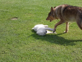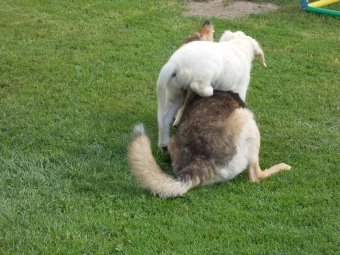 Manchmal kommt auch „El Jefe“ Black Jack dazu. Er will zwar nicht mit mir, sondern mit Bosse spielen – ist schließlich auch sein „Papa“ Bosse, aber ich darf auch mitmachen, und es stört ihn auch nicht, wenn ich mal in ihn reinhappse.