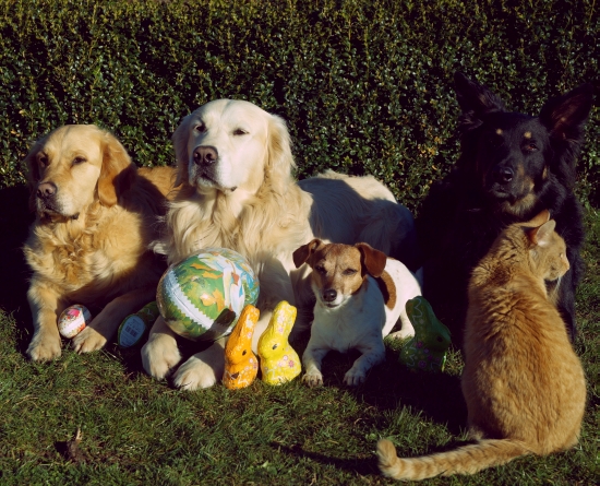 Um uns von den kleinen Woll-Hüpfern nicht die Show stehlen zu lassen, mussten wir Hunde jetzt natürlich nachlegen und so stiegen wir voller Eifer auf die Oster-Tricksereien ein.