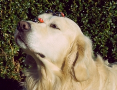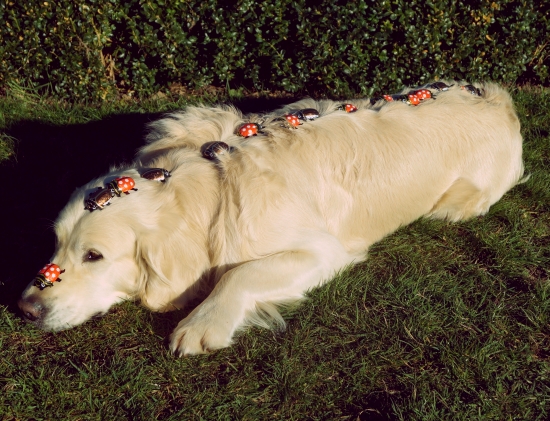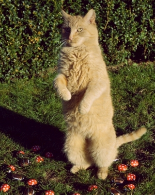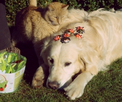Ginny bekam dann auch die Gelegenheit mit den versammelten Schoko-Käfern niedlich auszusehen. Das Wetter war so herrlich und die Farben leuchteten, die Chefs waren begeistert und wir Hunde waren auch sehr zufrieden – und schon war der Kater wieder mit im Bild!