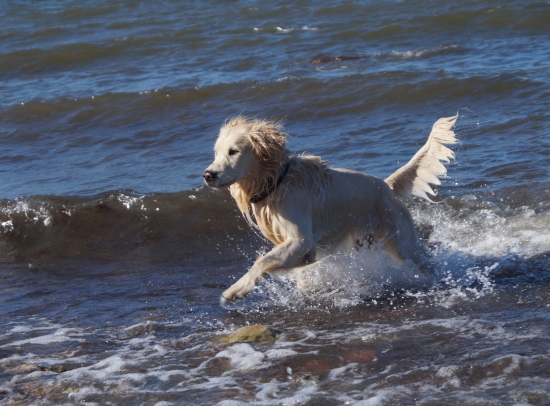 Durch den Wind gab es ein paar Schaumkrönchen, die der Sache den besonderen Kick gaben. Hund fühlt sich dann völlig frei - frei und stark und wild – es ist dann ganz egal, ob die Chefin einen Stein oder ein Stöckchen ins Wasser wirft, Hauptsache, ich kann rennen und schwimmen!
