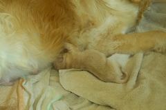 Nichts von wegen Unsicherheit oder Inkompetenz – ganz sicher in ihren Instinkten hat die kleine Mama ihre Welpen geboren, abegnabelt, ohne großes Gewese die Plazenta aufgefressen und die Kleinen an die Milchbar gelassen.
