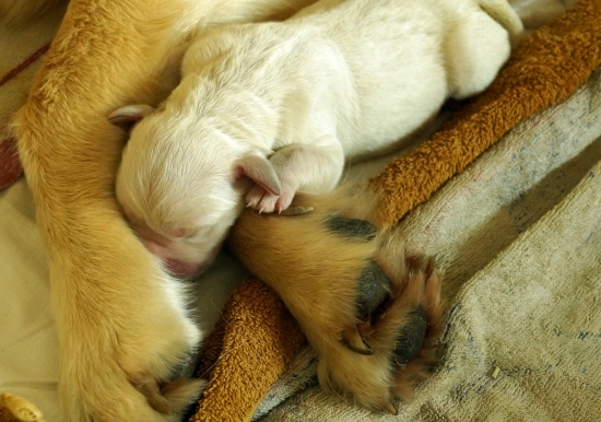 Hundemütter sind so selbstverständlich und dabei außerordentlich rührend mit ihren Babys. Da wird nicht groß gefackelt, sondern mit massierender Zunge jeder Widerstand weggeleckt. Danach liegen die Welpen wie hingemalt in der Armbeuge, im vollsten Vertrauen, dass sie nicht platt gelegen werden.