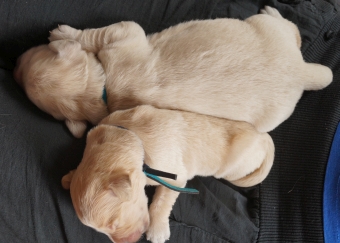 Hier seht ihr ihn nach einer Woche neben seinem blauen Bruder - da wo unser kleiner Dicker nur Muskeln und Plüschpopo war, war der Murkel hager und sehnig. Aber ein Kämpfer! Er gab nicht auf und versuchte tapfer seinen Anteil an der mütterlichen Milch zu ergattern.