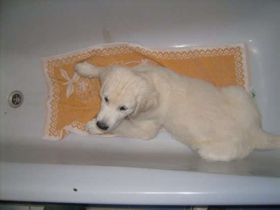Mein Zweitname „Mr. Cool“ hat sich wieder mal voll bewährt: Die Chefin hatte ein Handtuch in die Wanne gelegt, damit ich nicht rutsche und wir haben erstmal eine Runde „Sitz“ und „Platz“ geübt.