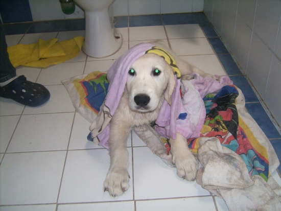 Dann kam auf einmal Wasser aus einem weißen Schlauch und überall lagen Leckerchen rum – ich glaube, ich werde jetzt regelmäßig baden!