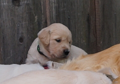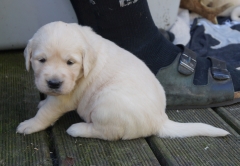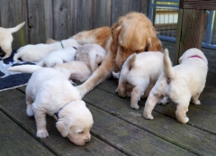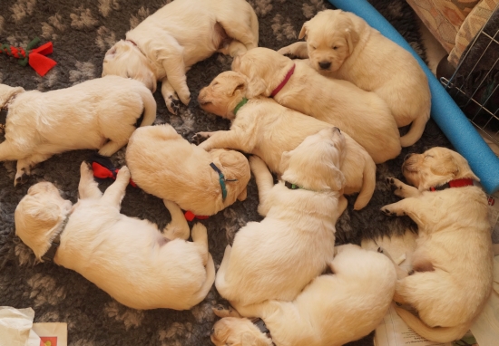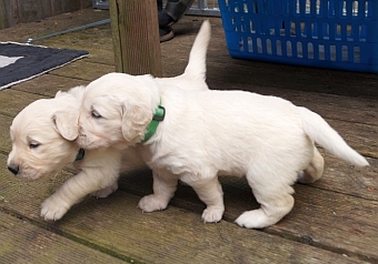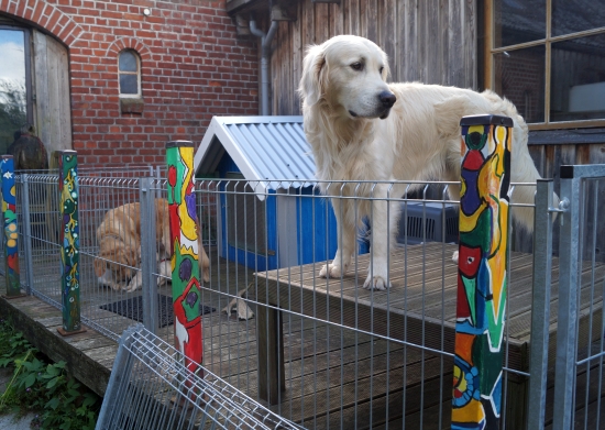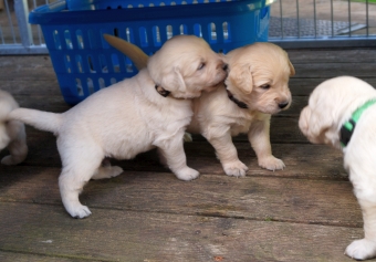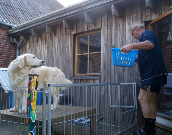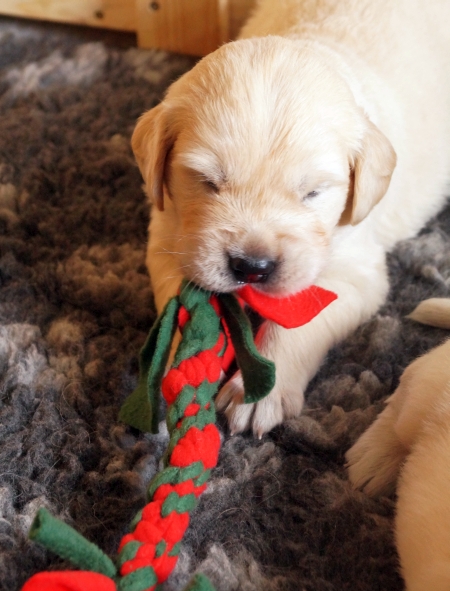 Im Welpenauslauf gibt es die ersten fremden Materialien und Spielzeuge und siehe – die Golden Retriever apportieren schon mit drei Wochen!