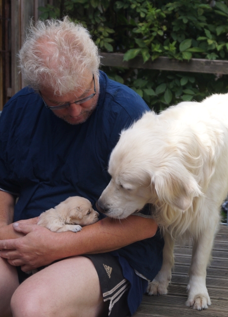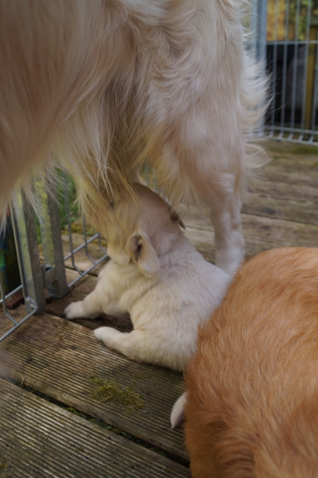 Der Chef hatte den Murkel gerettet, der natürlich nicht an die mütterliche Sicherheitszitze gelangt war, und knurrend allein durch den Welpenauslauf krabbelte, der tapfere kleine Kämpfer. Sobald er menschlichen Schutz gefunden hatte, beruhigte er sich wieder und war wieder ganz neugierig. Ich habe ihn beruhigend angehaucht, das fand er überaus ermutigend.