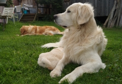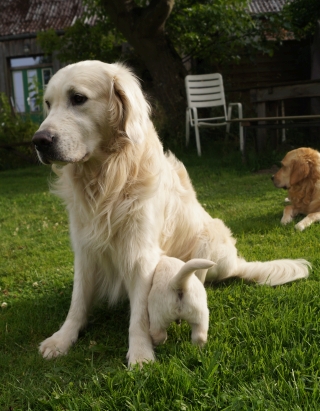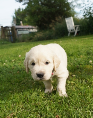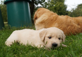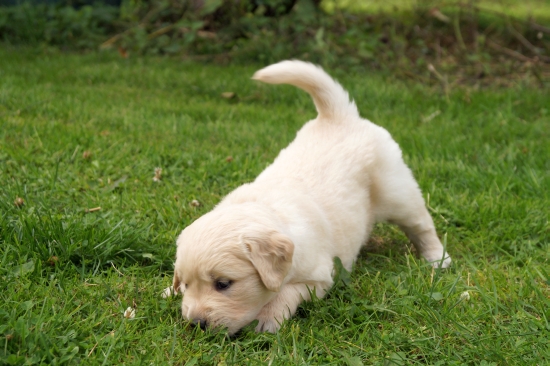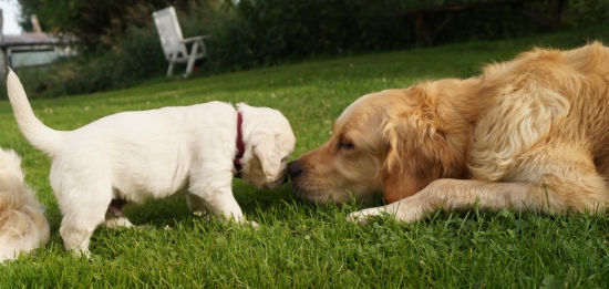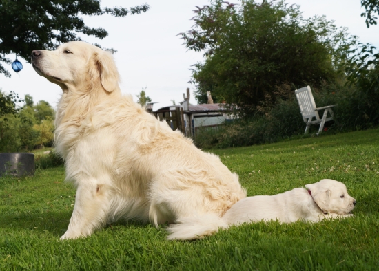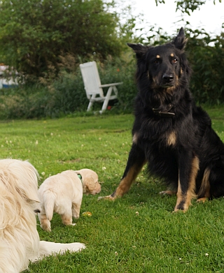 Um den ersten Schritt in die große Welt ohne Begrenzungen und doppelten Boden mit jedem Welpen intensiv gestalten zu können, hat die Chefin die Carlitinchen einzeln oder zu zweit in den letzten Tagen mit in den Obstgarten unter den Walnussbaum genommen.