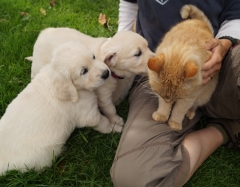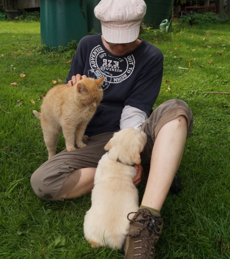 Heute hat Signore Giovanni, unser 10-jähriger Kater, beschlossen die Carlitinchen kennenzulernen. Normalerweise ist er draußen immer mit uns zusammen, aber seit die Welpen den Garten erobert haben, war er vorübergehend auf Abstand gegangen.