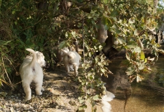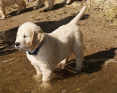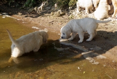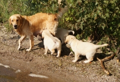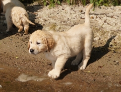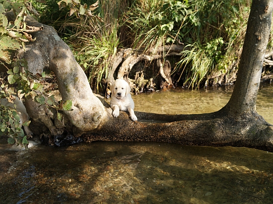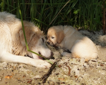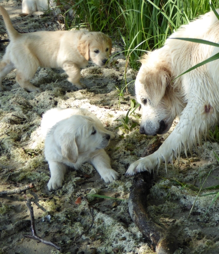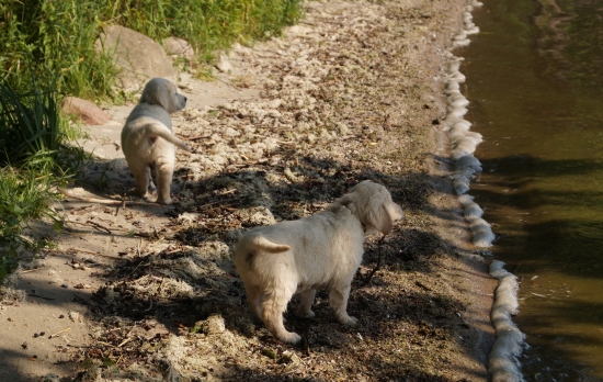 Am Wasser wurde sofort auf Erkundung umgeschaltet, nichts mehr mit gemütlich und geduldig – in meinen Welpen steckt deutlich das „Carlito Colombo“-Gen. Sie sind zwar nicht gleich schwimmen gegangen, aber vorsichtig wurden die dicken Pfoten ins Wasser gesteckt und an der Seite von Mama Ginger das ganze Ufer erkundet.