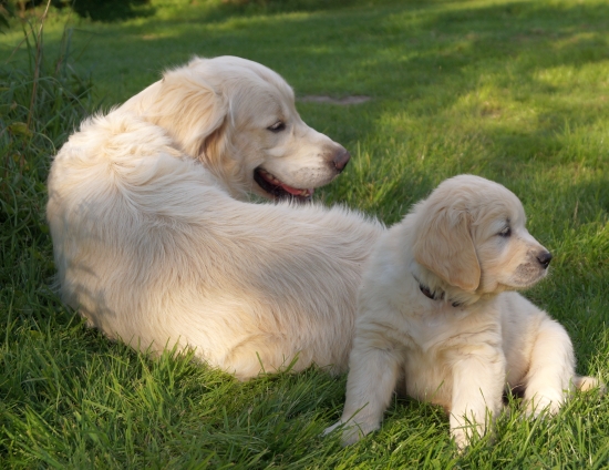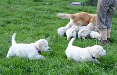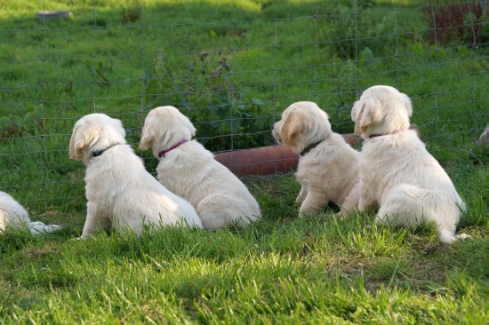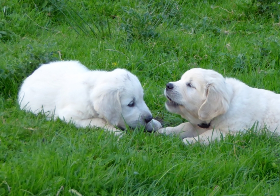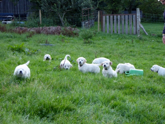 Die Chefin hingegen fürchtete Bauchweh und Durchfall und so wurden die Welpen schnellstens wieder von der Koppel gescheucht. Die nächsten Ausflüge gingen dann zum Hundeplatz und in den Garten, so dass keine zarten Versuchungen mehr herum lagen.