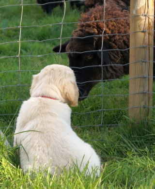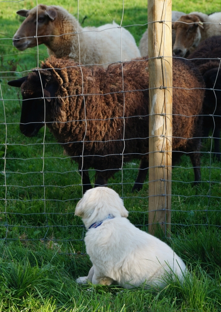 Amanda, hat sich lieber neben den großen Papa gesetzt, wahrscheinlich hatte sie die Hoffnung, dass das Schaf mich anschnobern würde, wenn es in unsere Richtung gekommen wäre. Da dies nicht passierte, konnte ich ihr völlig coole Souveränität vermitteln, außerdem weiß ich natürlich, dass die Schafe nicht durch den Zaun können!