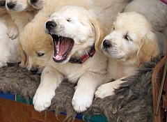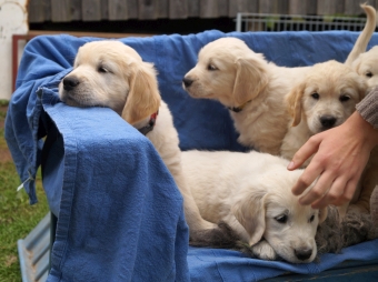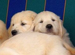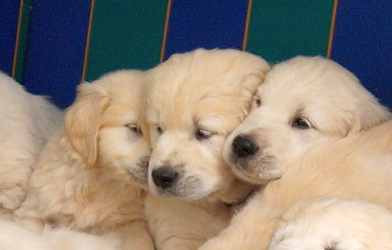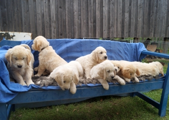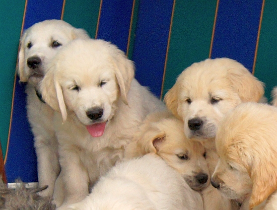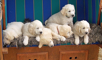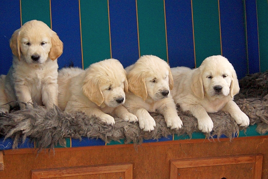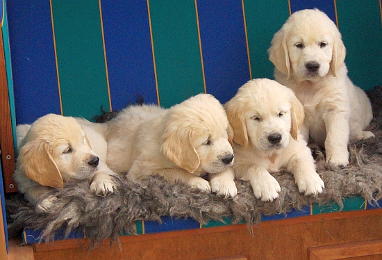 Im wachen Zustand wurden die Welpen alle auf die blaue Bank, die zur Verstärkung mit einer Decke und dem großen Schaffell ausstaffiert worden war, gesetzt. Aber ein ruhiges Knipsen erwies sich als Ding der Ummöglichkeit: Einzig Arturo sass wie der Fels am Rand der Bank (ein wahrer Sohn seines Vaters!), aber die anderen hampelten herum, versuchten vorne wieder runter zu hüpfen oder plumpsten seitlich mit samt Decke wieder auf den Boden.