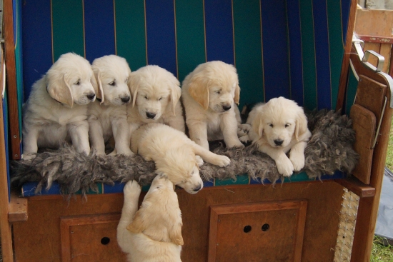 Durch das ganze Tohowabohu erschöpft schliefen die ersten schon fast wieder ein, aber es gibt wenigstens ein Bild, wo alle sechs wach sind, auch wenn Carlito Junior gerade dabei ist, den Strandkorb zu verlassen.