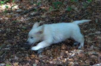 Der hatte übrigens den totalen Flash im Wald! Murkel-Man flitzte durch das Laub, blieb manchmal an einem Ast hängen, überschlug sich und raste dann weiter – eigentlich müsste er Förstershund werden! Voller überschäumender Freude spielte er alle seine Geschwister an oder vertiefte sich in die tausend Waldgerüchte – im Wald erwachen Murkel's Lebensgeister!