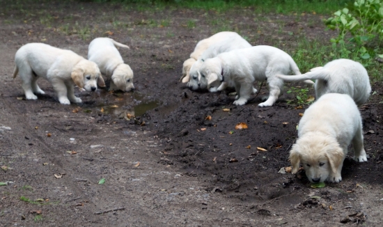 Die Chefin hatte die Idee noch ein paar Schritte auf dem Waldweg spazieren zu gehen, aber die Welpen blieben gleich an der ersten Kreuzung hängen, weil sie ein Schlammloch entdeckt hatten.